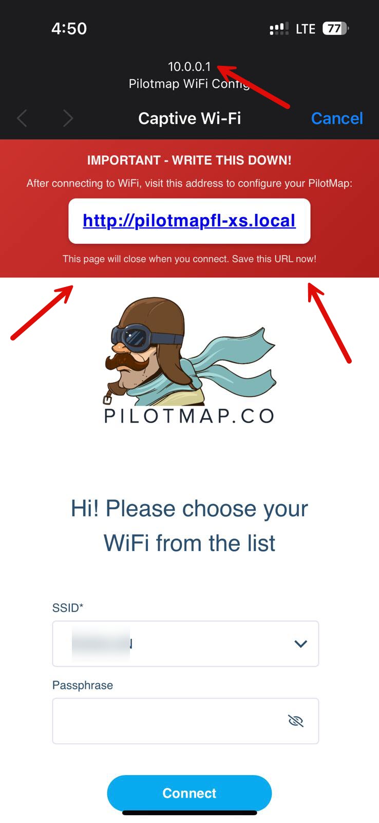 After connecting to WiFi, visit this address to configure your PilotMap:
